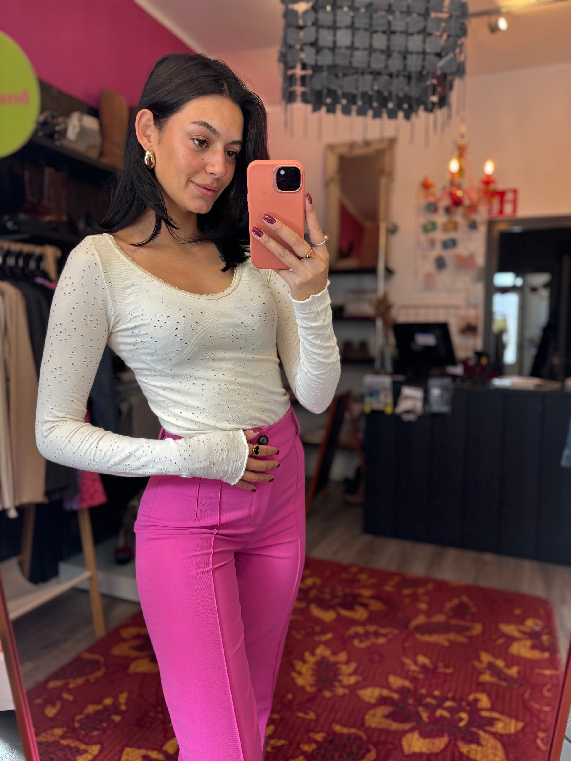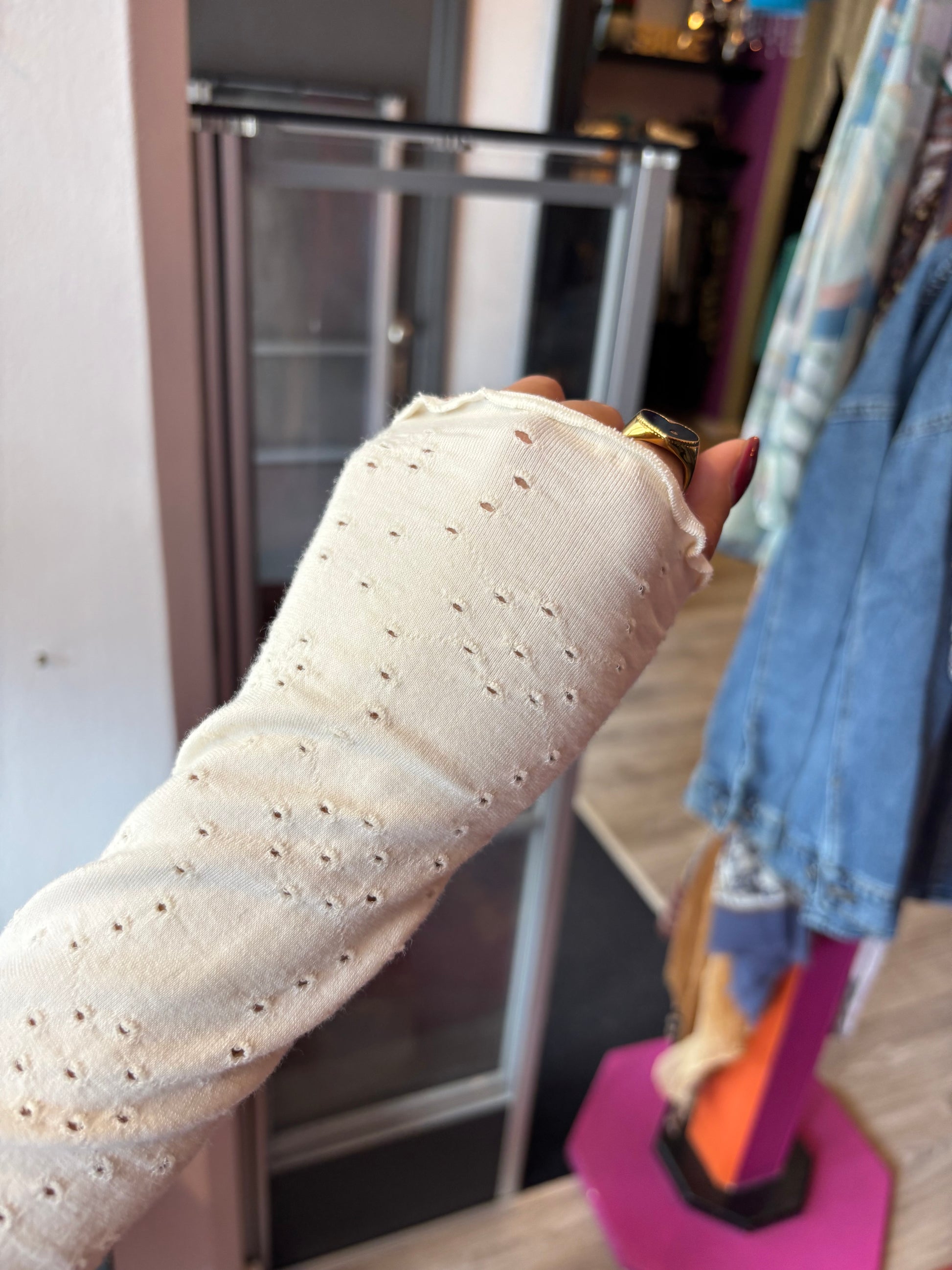Bij elk product staat de maat duidelijk vermeld. Dit is de exacte maat zoals aangegeven op het label. Om een zo goed mogelijk beeld van de pasvorm te geven, gebruikt Dominique soms clips om de kleding mooi passend te maken voor de foto’s.