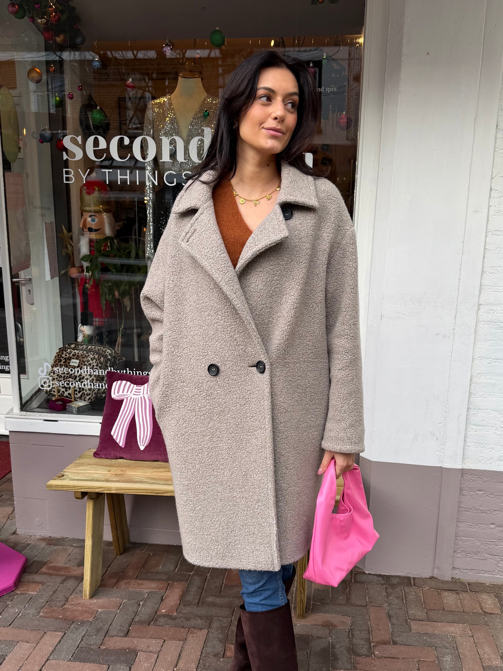De jas heeft een stevige, kwalitatief hoogwaardige wolrijke stof die bekendstaat om zijn luxe uitstraling en lange levensduur. Cinzia Rocca werkt enkel met zorgvuldig geselecteerde materialen en dat zie én voel je direct terug in dit ontwerp.