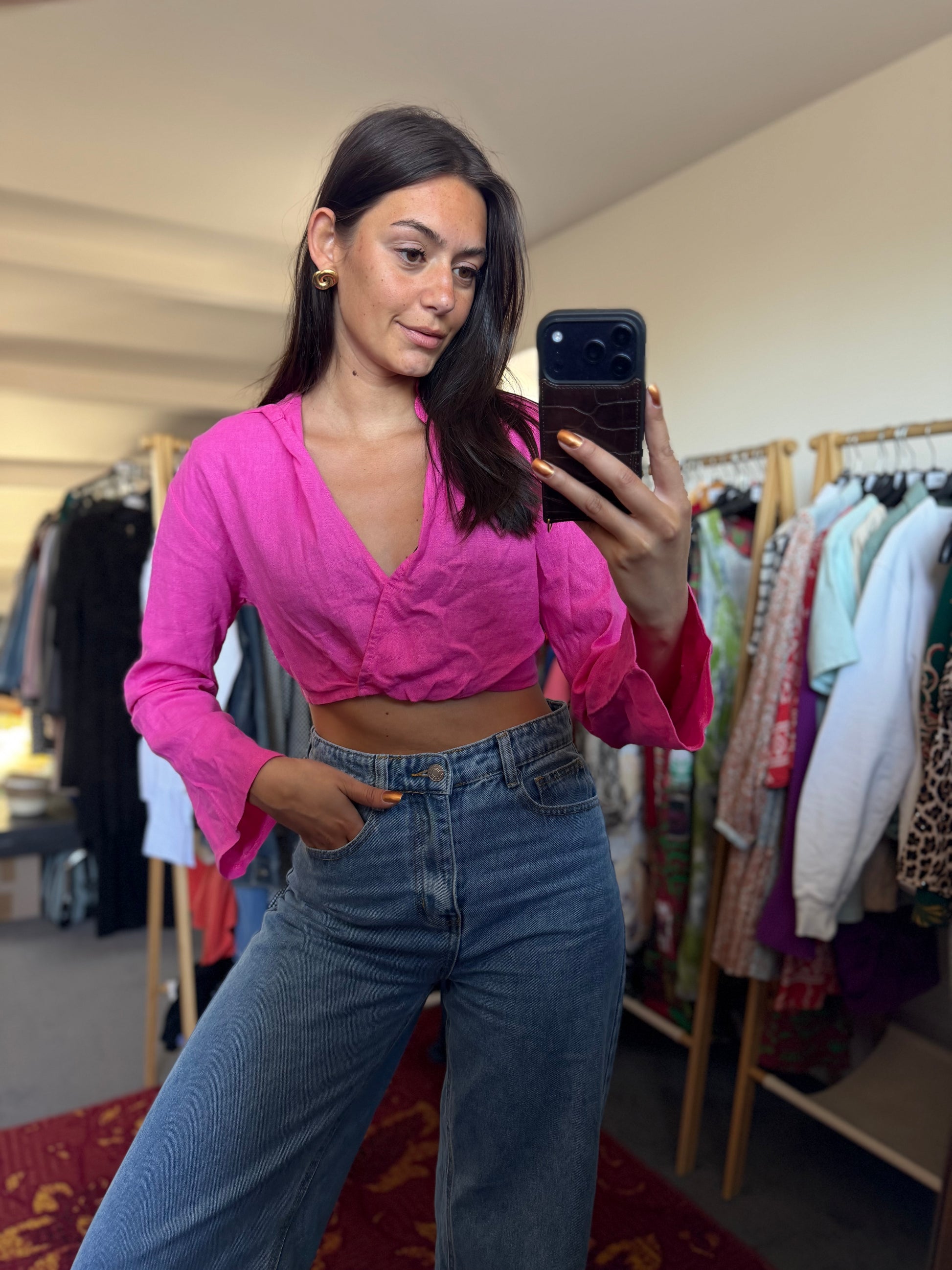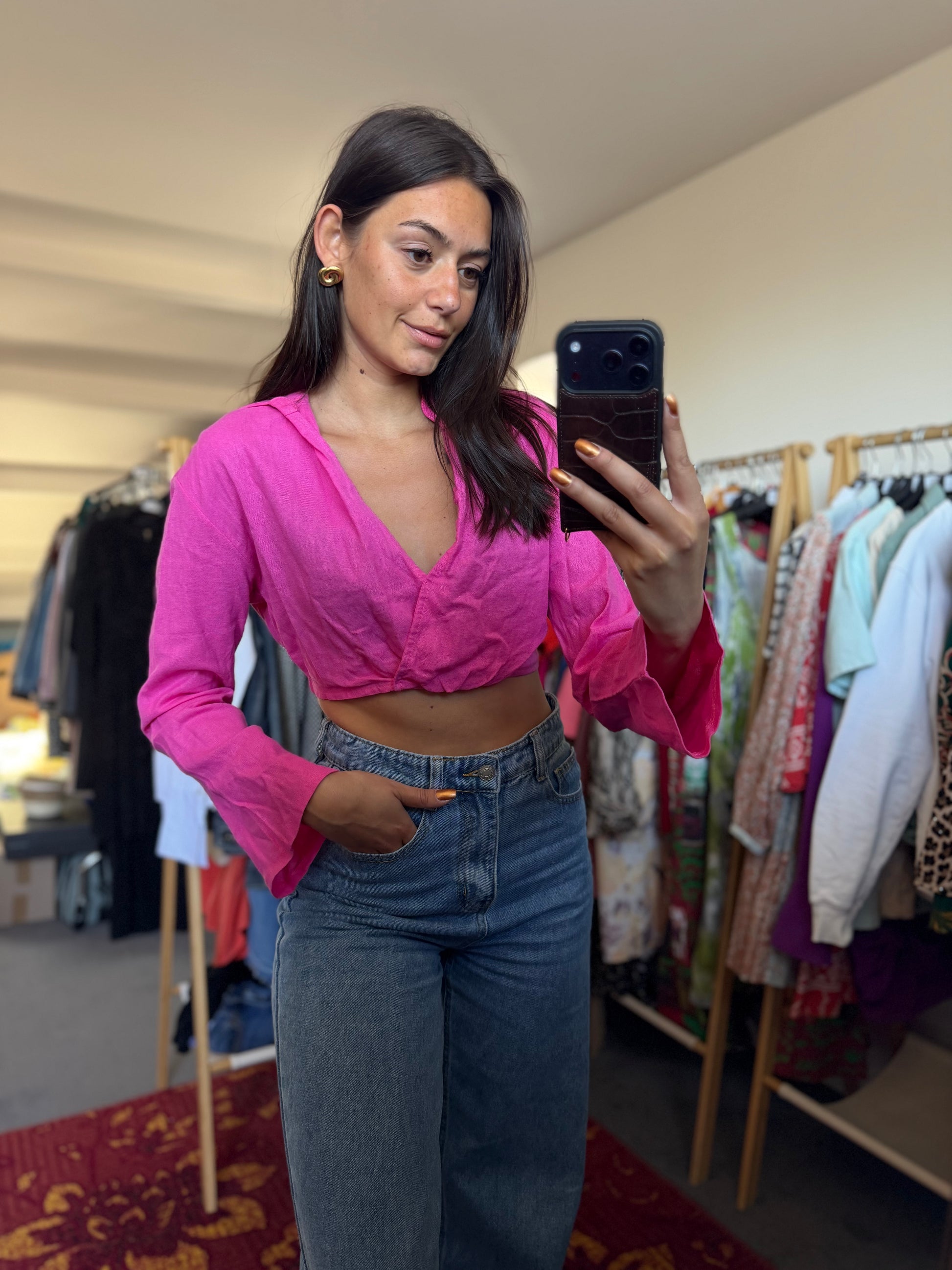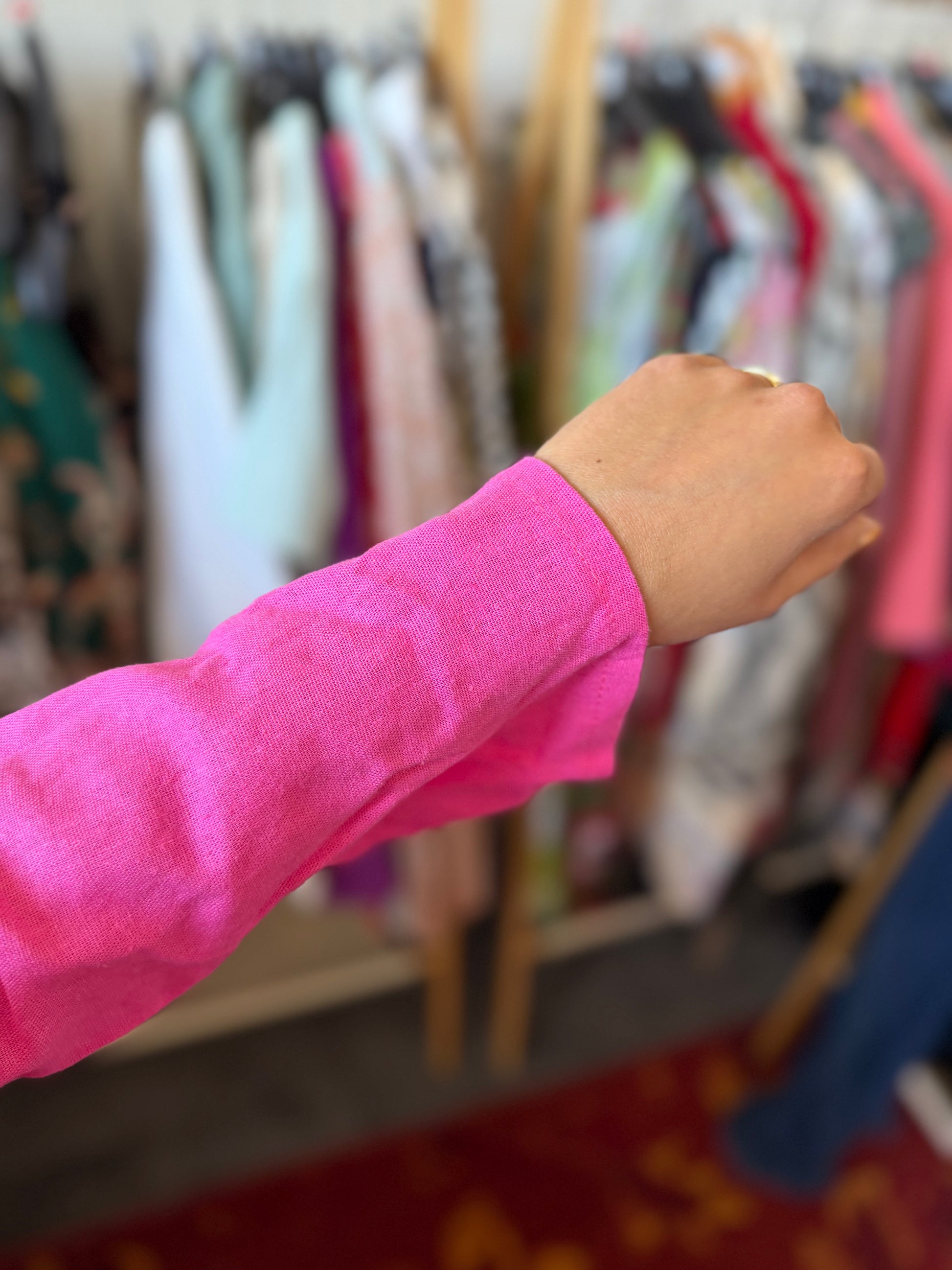 The size is clearly indicated on each product. This is the exact size as indicated on the label. To give the best possible impression of the fit, Dominique sometimes uses clips to adjust the clothing for the photos.