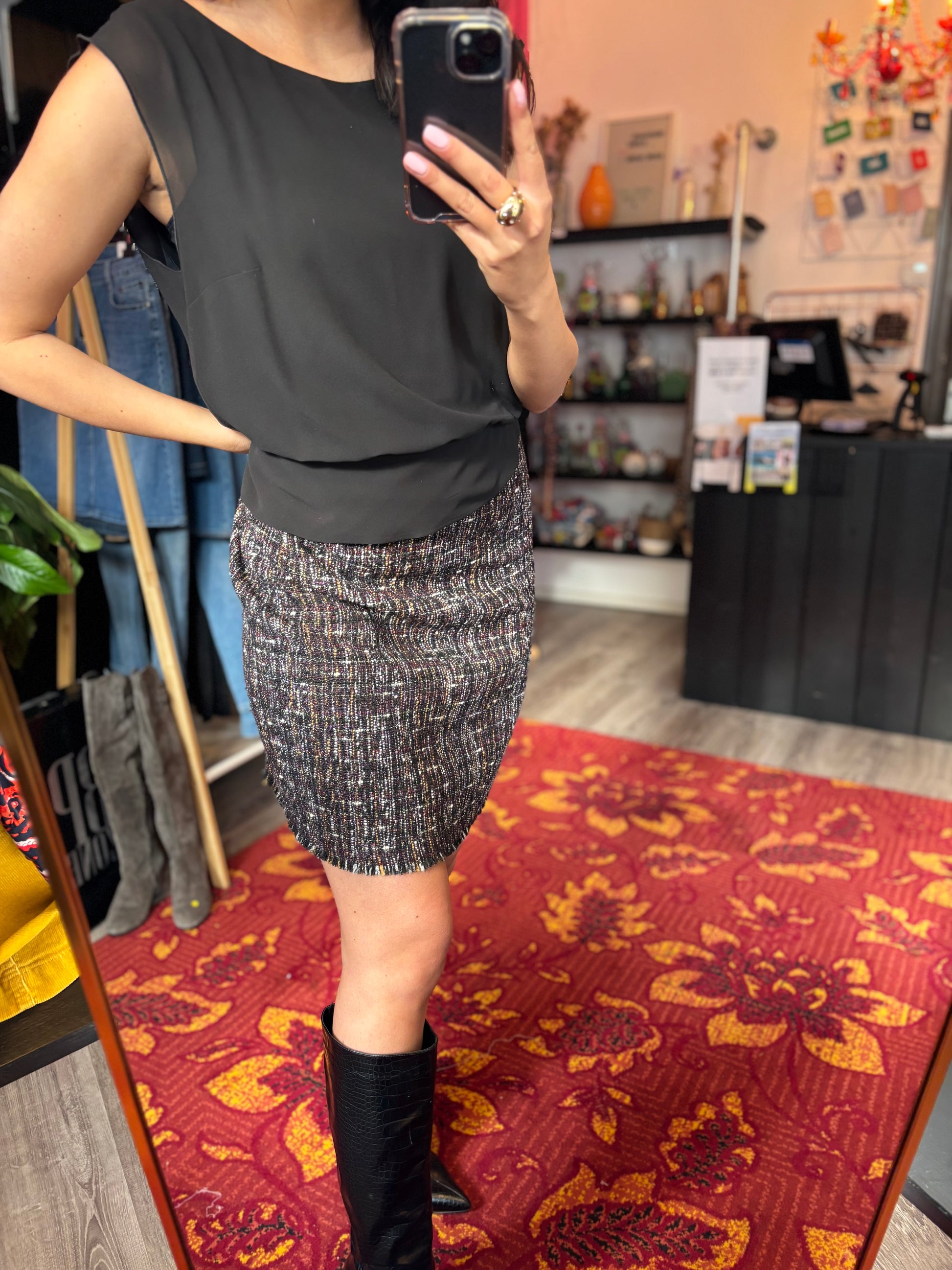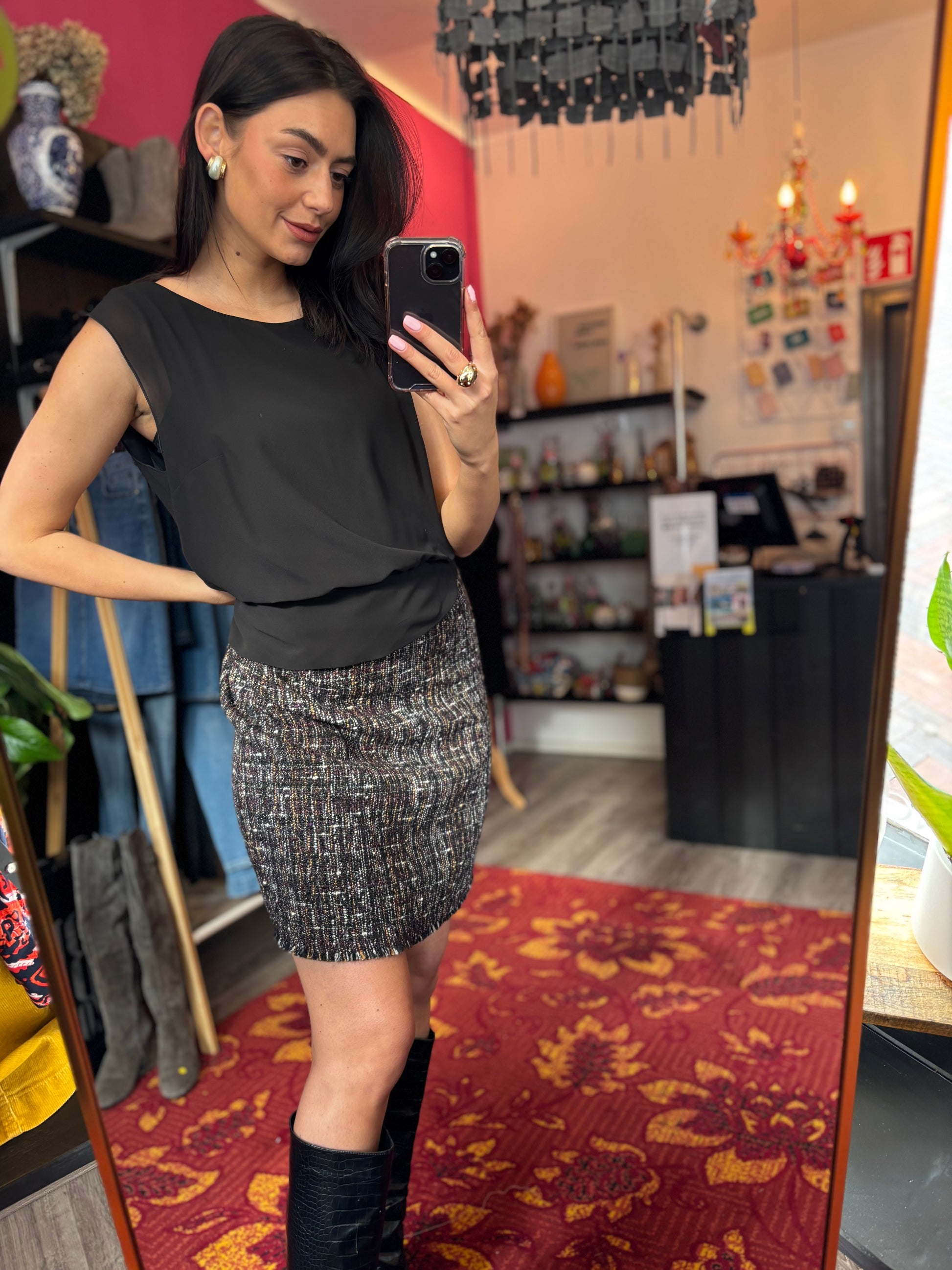Dominique is 173 cm lang en draagt verschillende maten op de foto’s.
