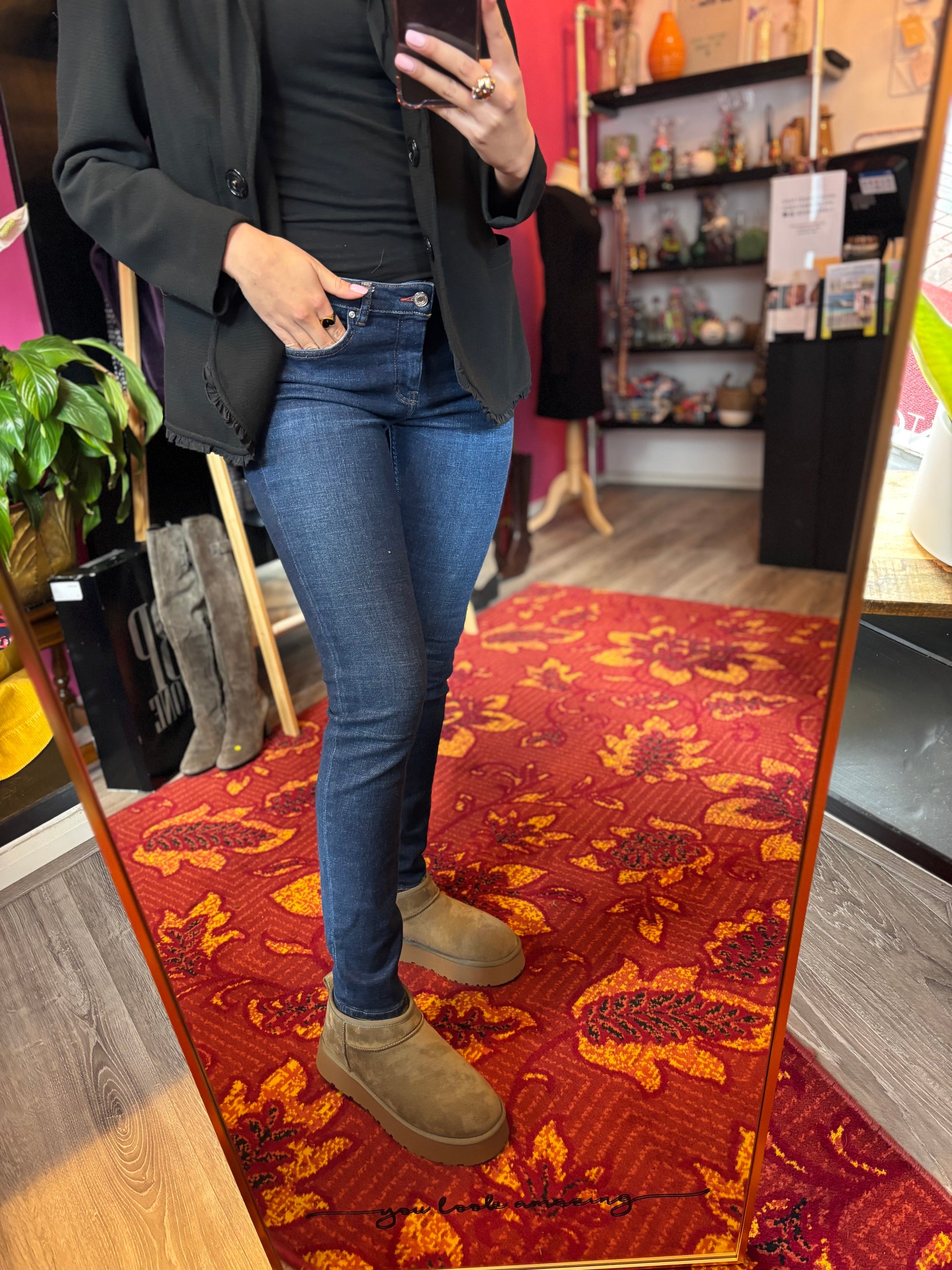 Dominique is 173 cm lang en draagt verschillende maten op de foto’s.