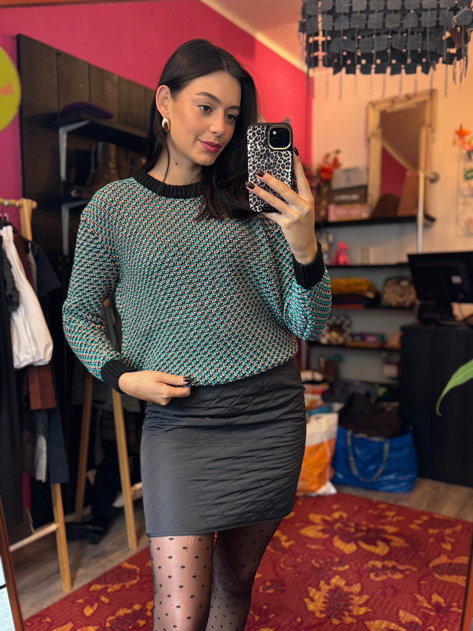 Dominique is 173 cm lang en draagt verschillende maten op de foto’s.