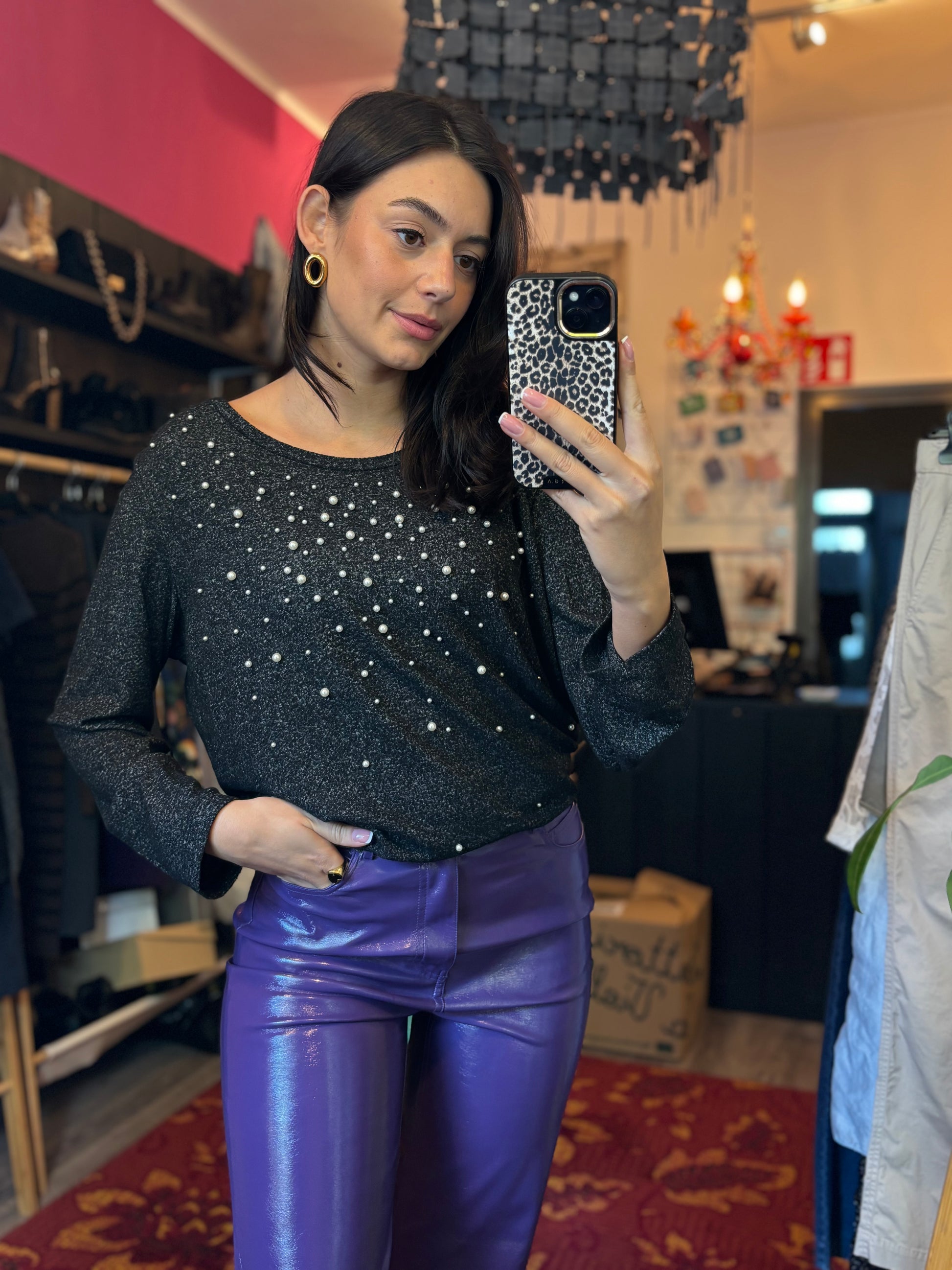 Dominique is 173 cm lang en draagt verschillende maten op de foto’s.