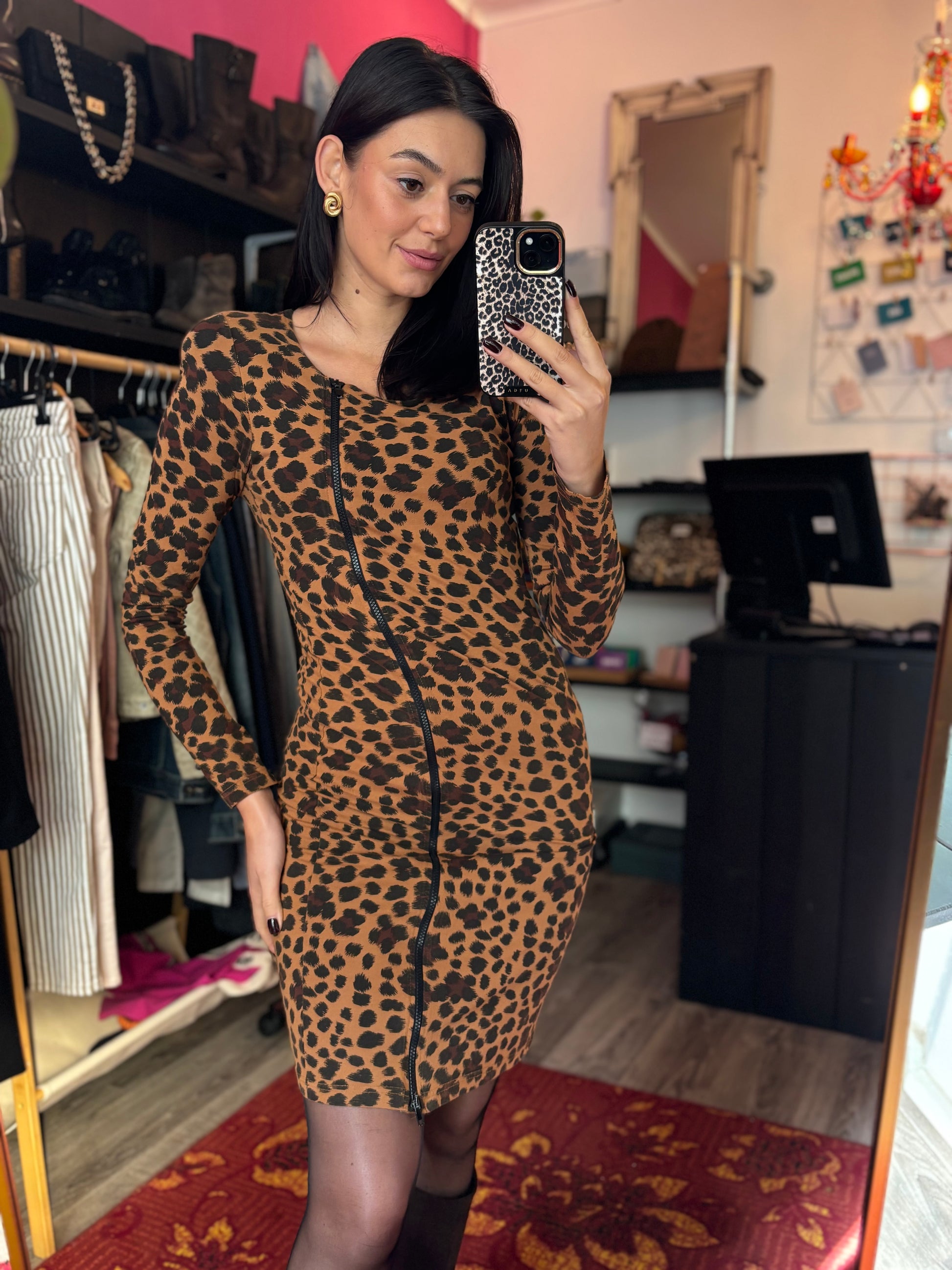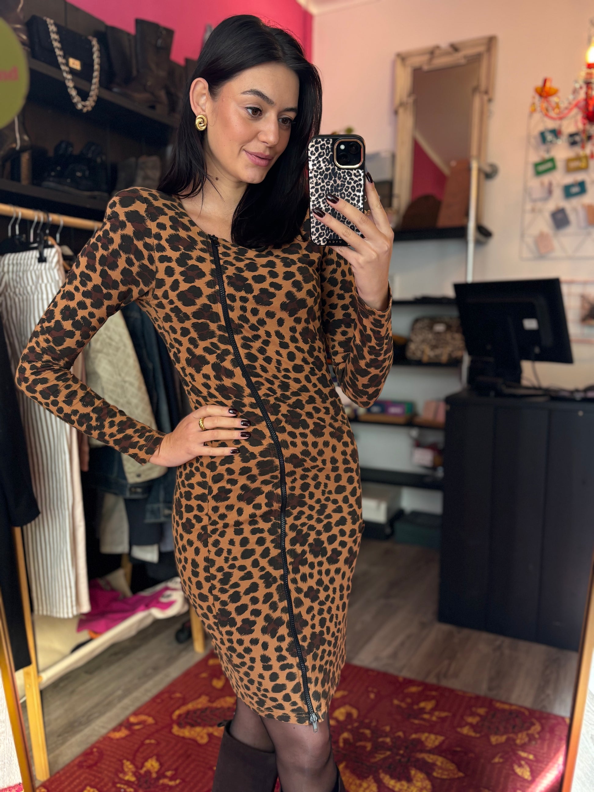 Dominique is 173 cm lang en draagt verschillende maten op de foto’s.