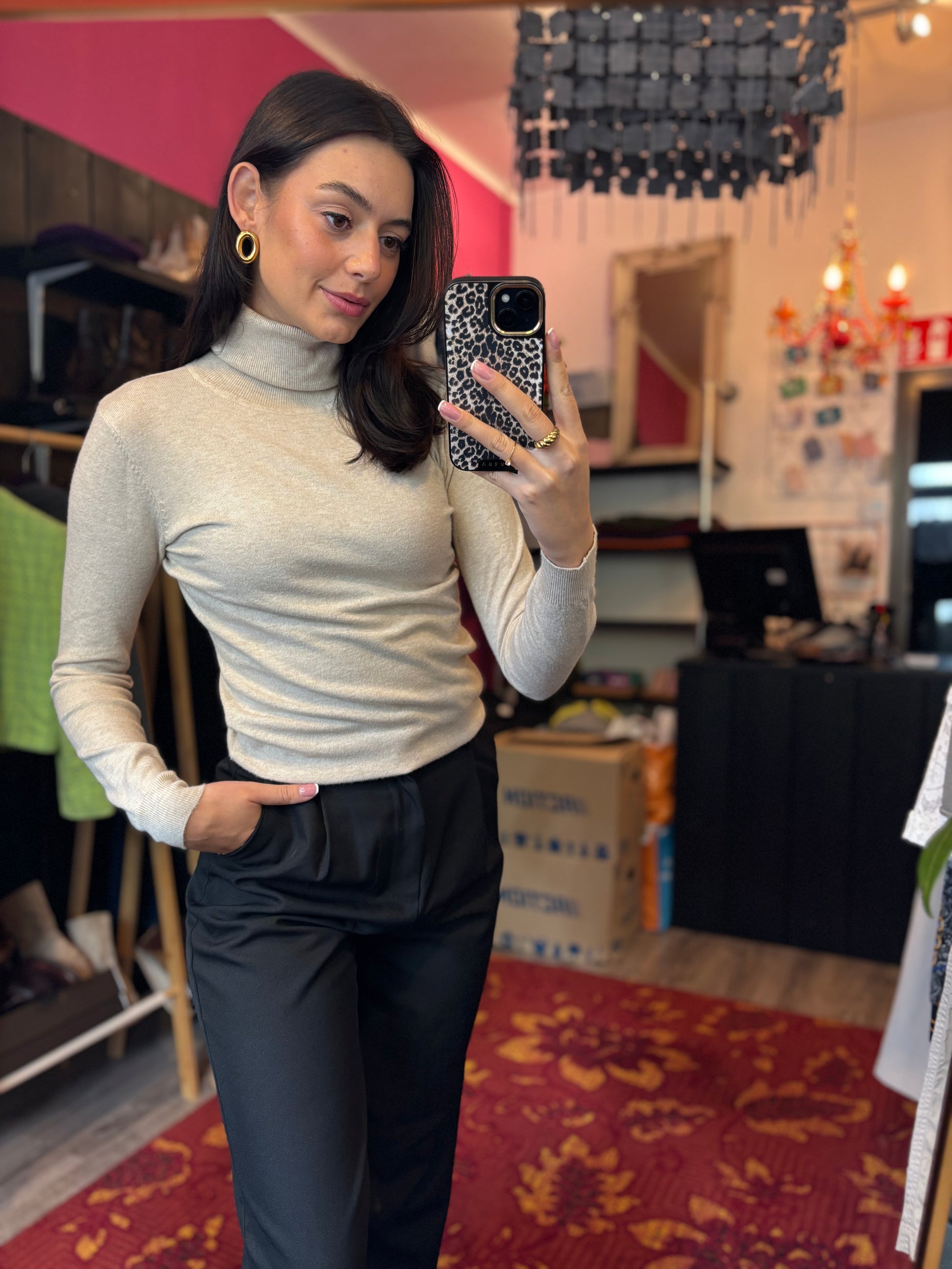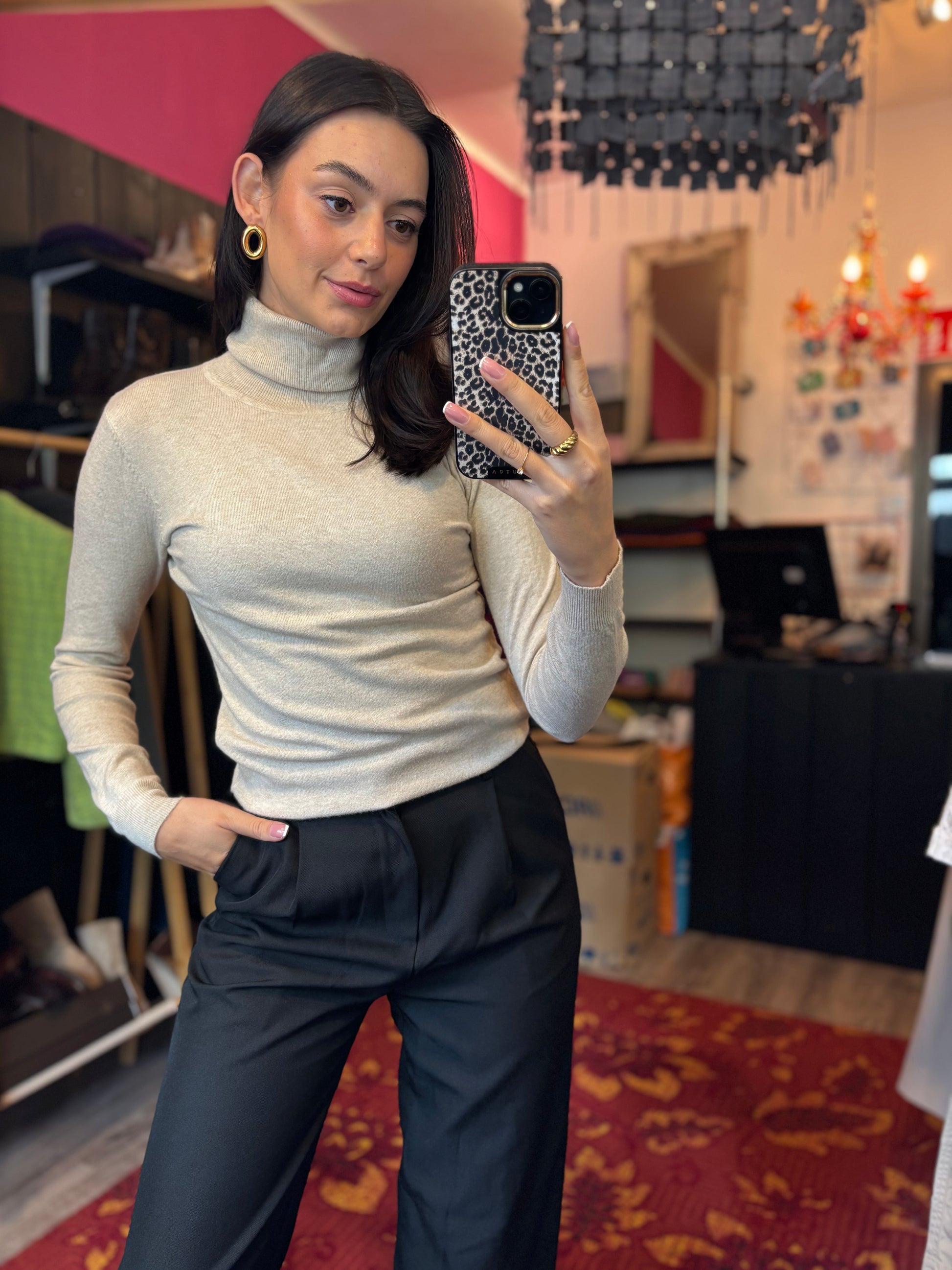 Dominique is 173 cm lang en draagt verschillende maten op de foto’s.