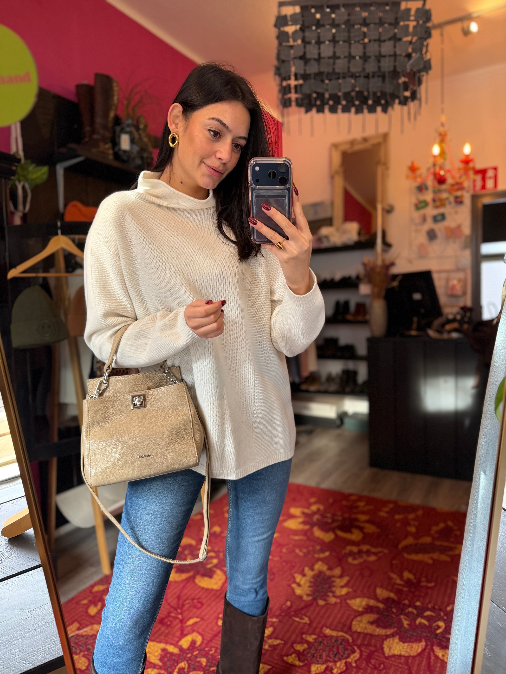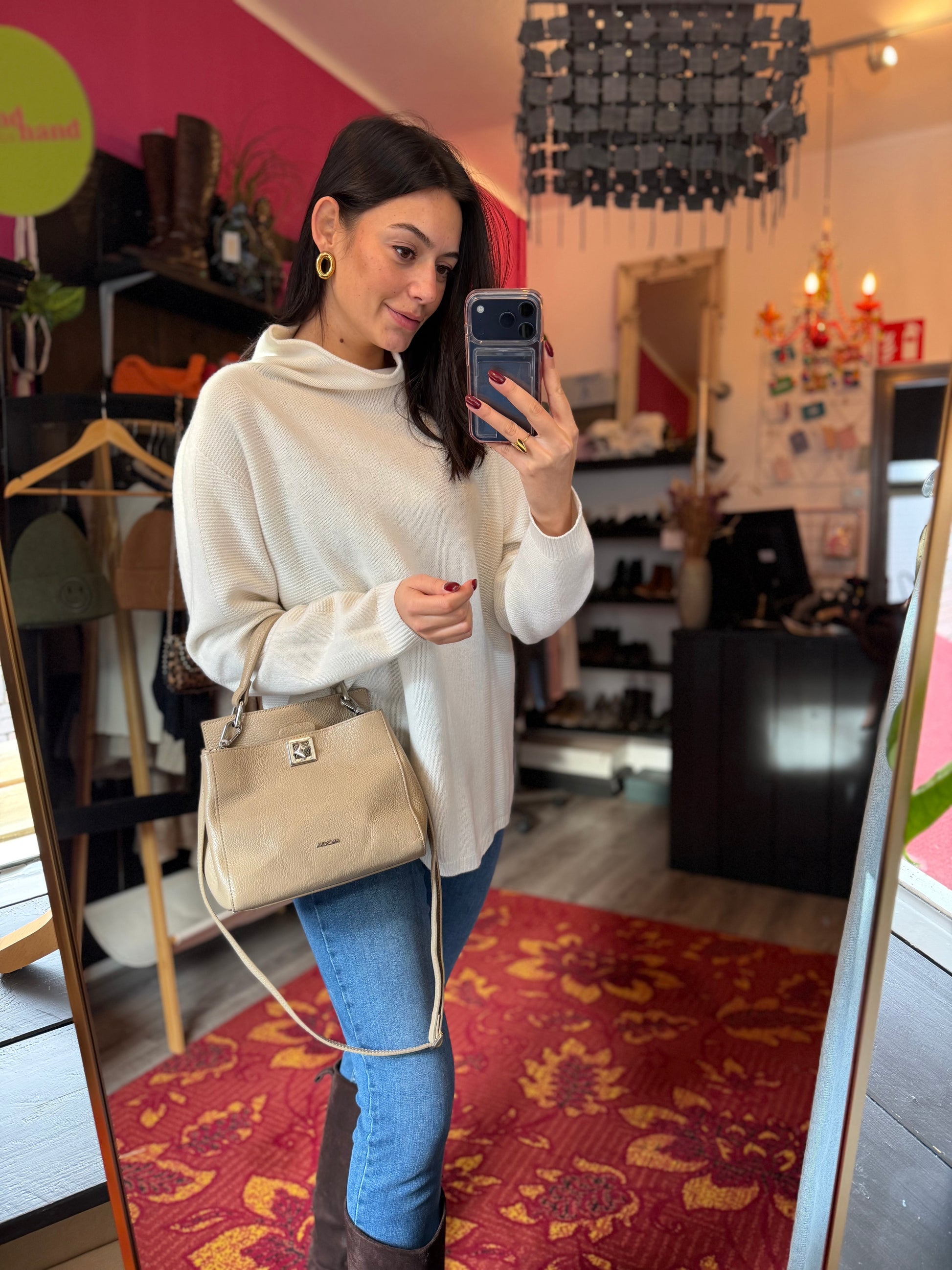 Dominique is 173 cm lang en draagt verschillende maten op de foto’s.
