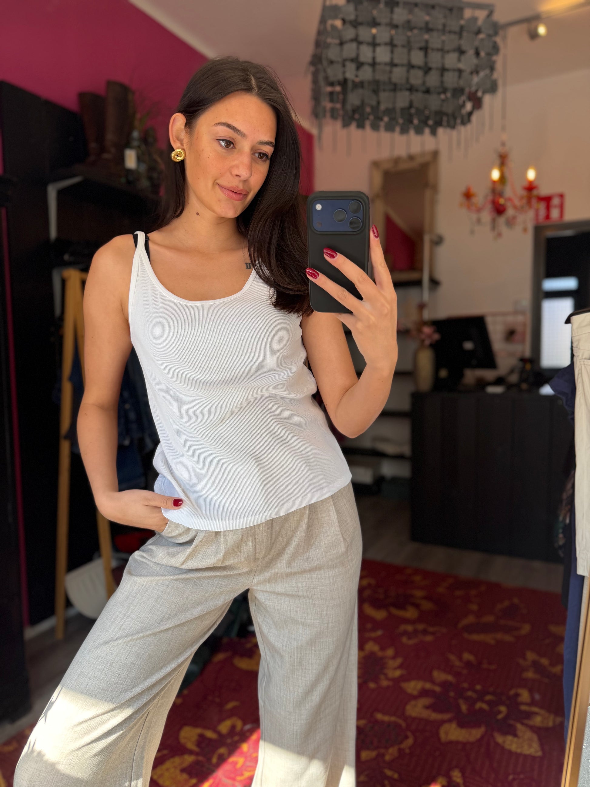 Dominique is 173 cm lang en draagt verschillende maten op de foto’s.