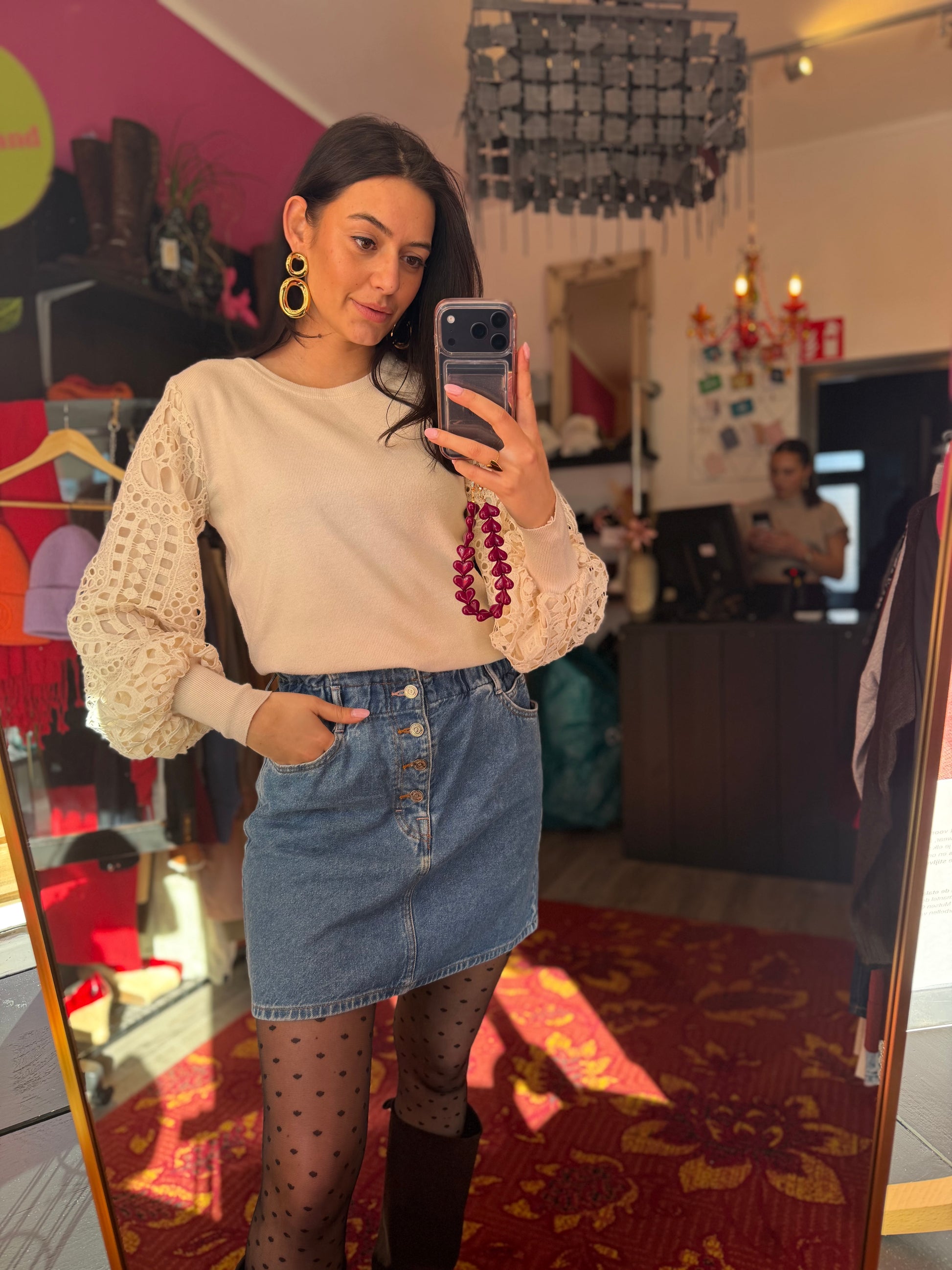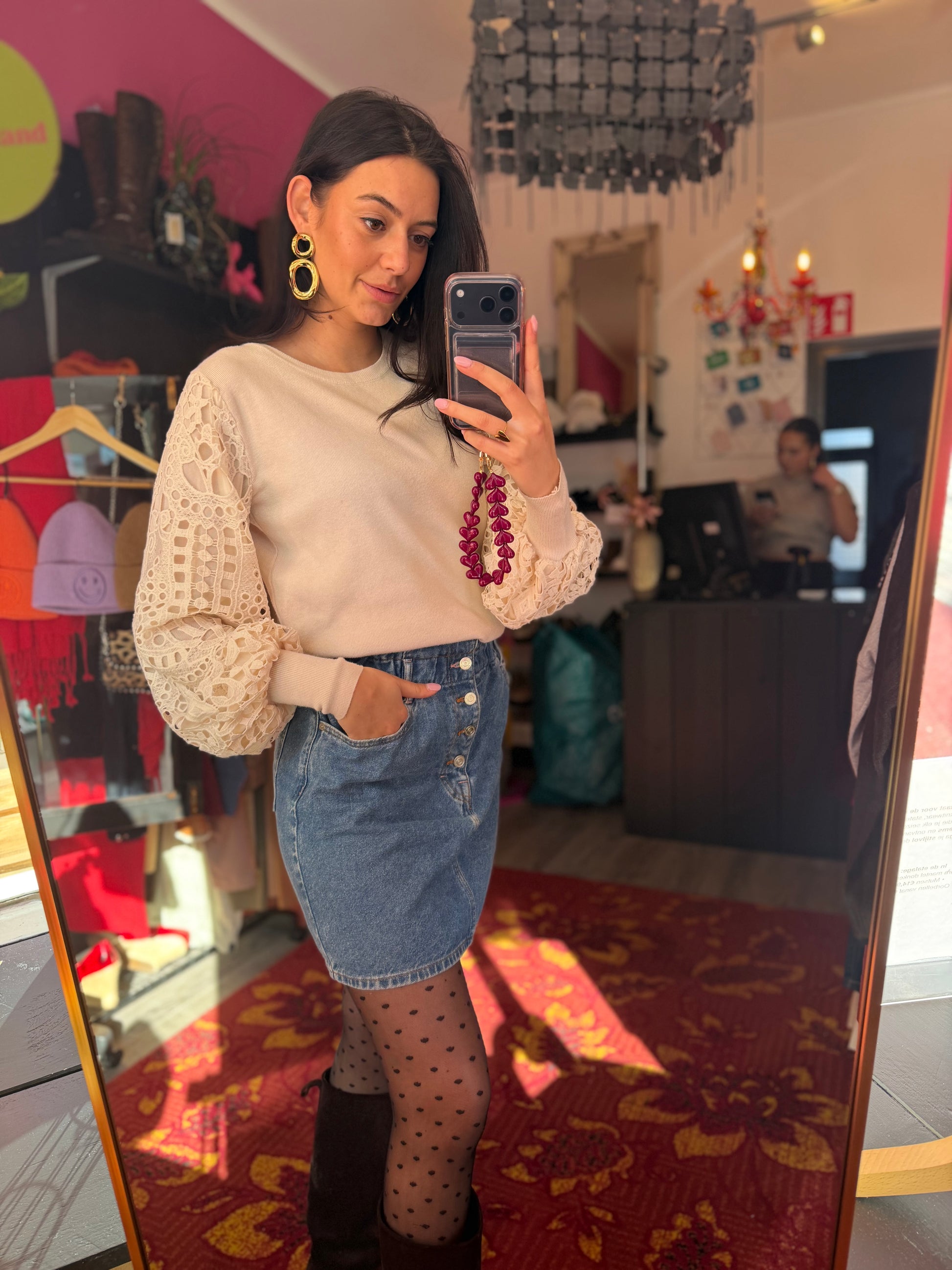 Dominique is 173 cm lang en draagt verschillende maten op de foto’s.