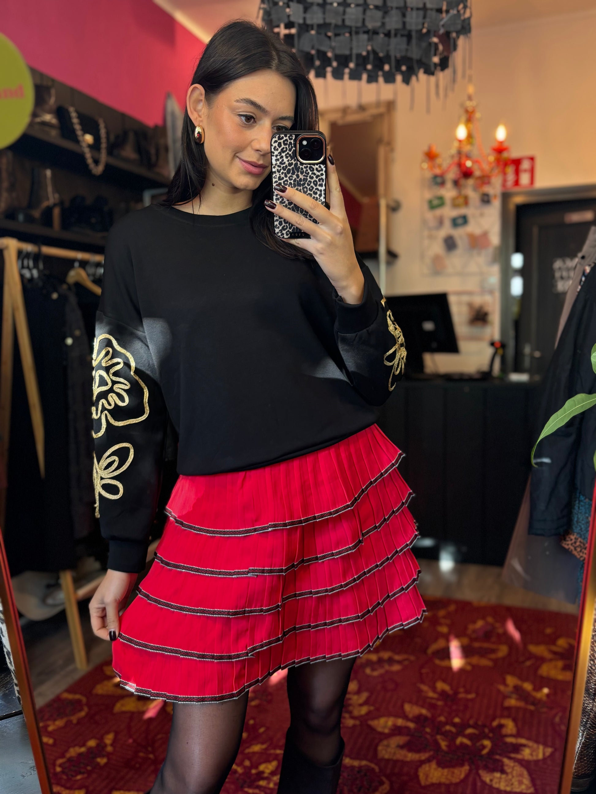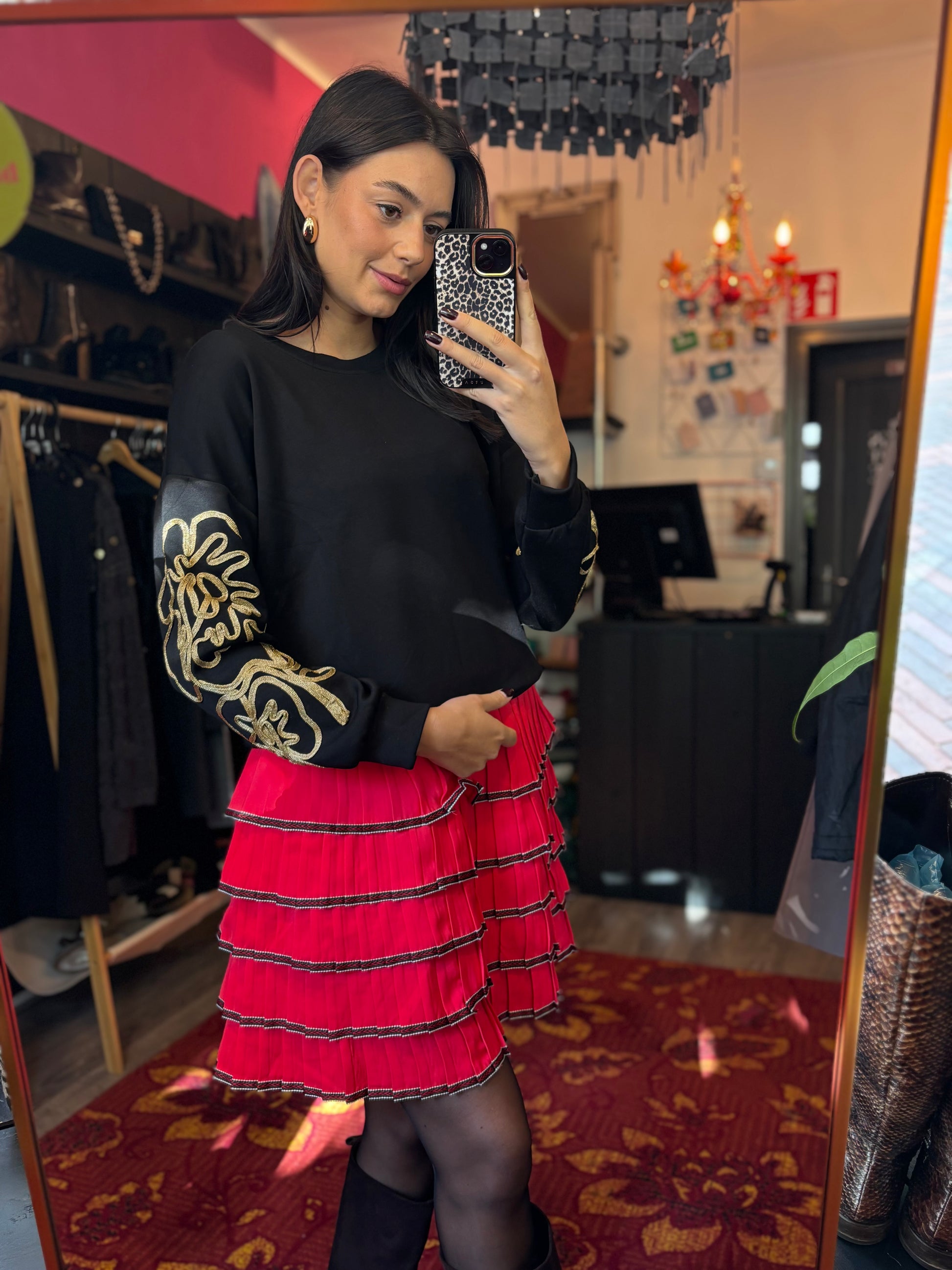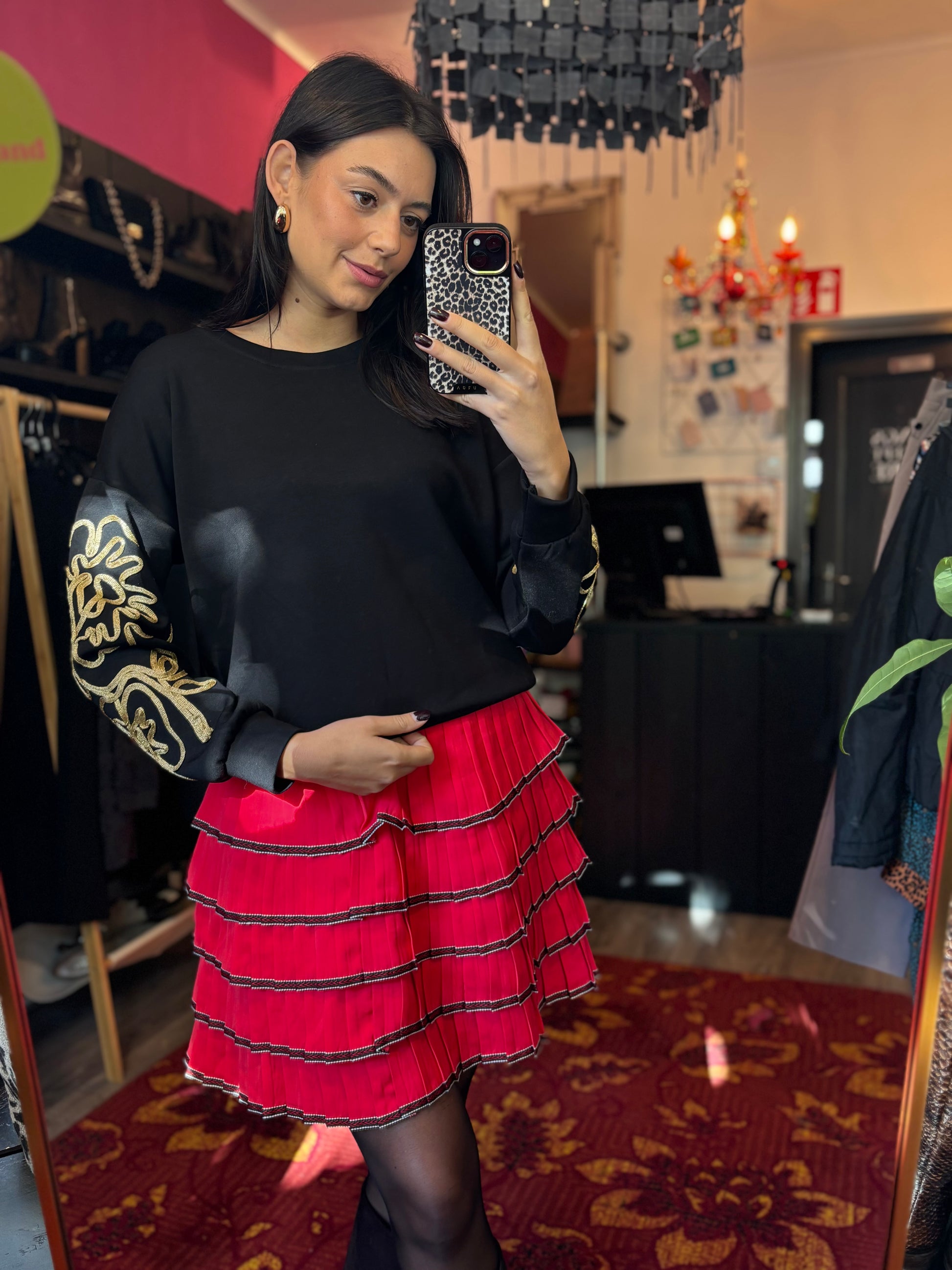 Dominique is 173 cm lang en draagt verschillende maten op de foto’s.