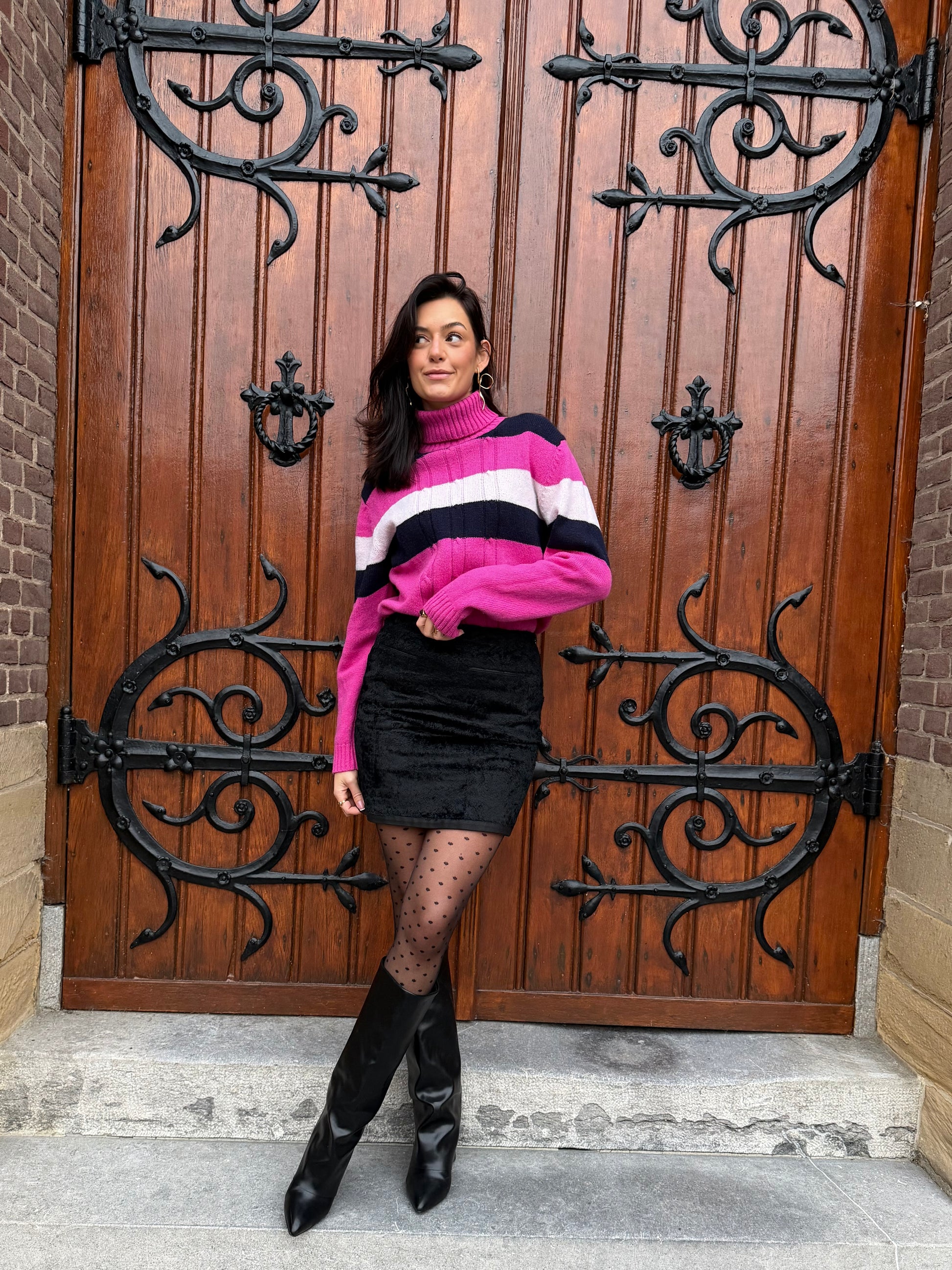 Dominique is 173 cm lang en draagt verschillende maten op de foto’s.