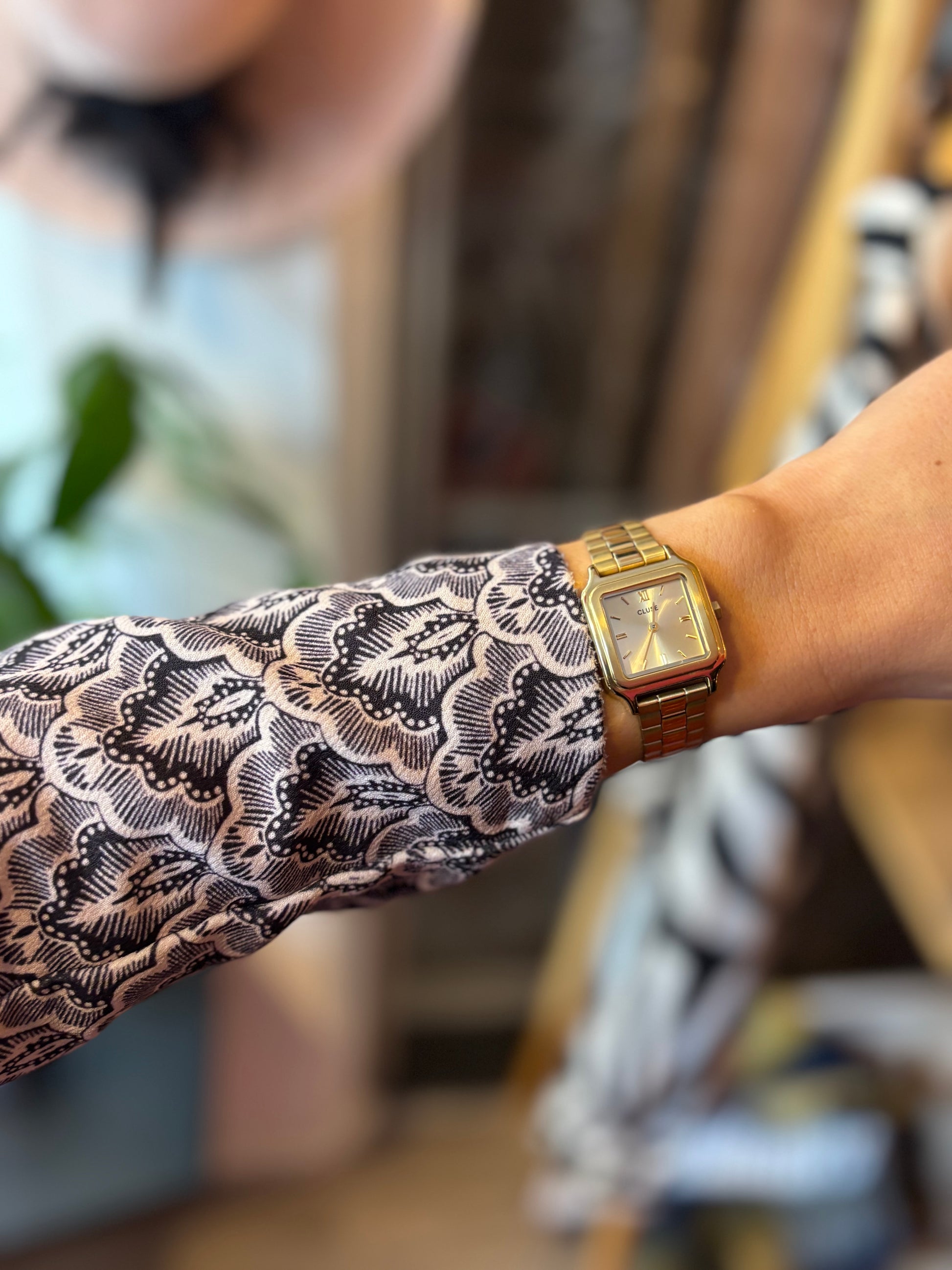 Bij elk product staat de maat duidelijk vermeld. Dit is de exacte maat zoals aangegeven op het label. Om een zo goed mogelijk beeld van de pasvorm te geven, gebruikt Dominique soms clips om de kleding mooi passend te maken voor de foto’s.
